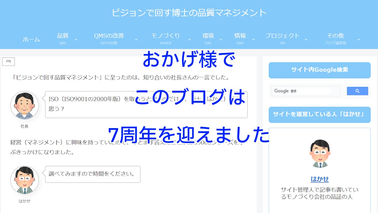 このブログ[ビジョンで回す博士の品質マネジメント]は、7周年を迎えることができました。