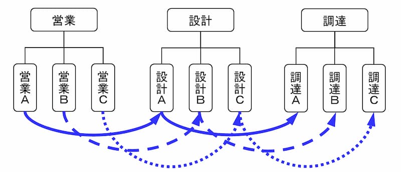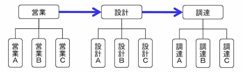 この状態は、社内組織では営業部門、設計部門、調達部門にわかれているものの、実態としては、各部門の担当者個人(営業、担当設計者、調達担当者)で仕事が進められていることになります。