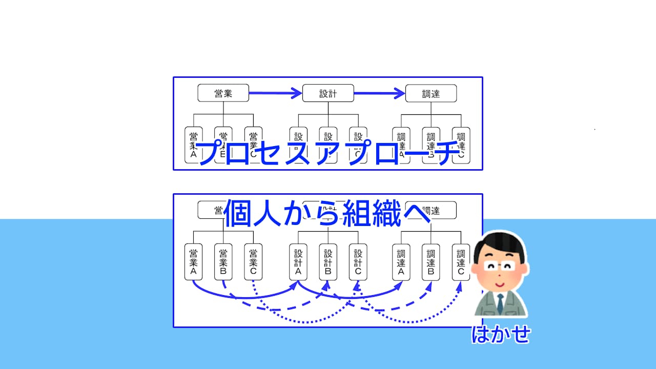 ここでは、会社のプロセスを、営業、設計、調達(製造委託を含む購買)の3つにわけて、属人化した組織と組織による仕事の進め方と、会社規模(社員数)が増えることによる問題や課題について説明します。