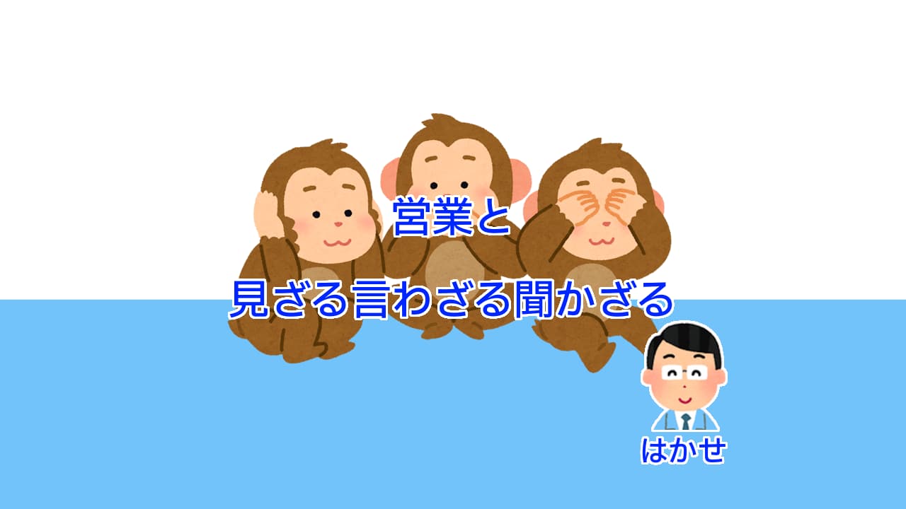 ここでは、日光三猿の本来の意味ではなく、「見ざる・言わざる・聞かざる」の言葉に注目して、営業とお客様とのコミュニケーションにおけるポイントを説明します。