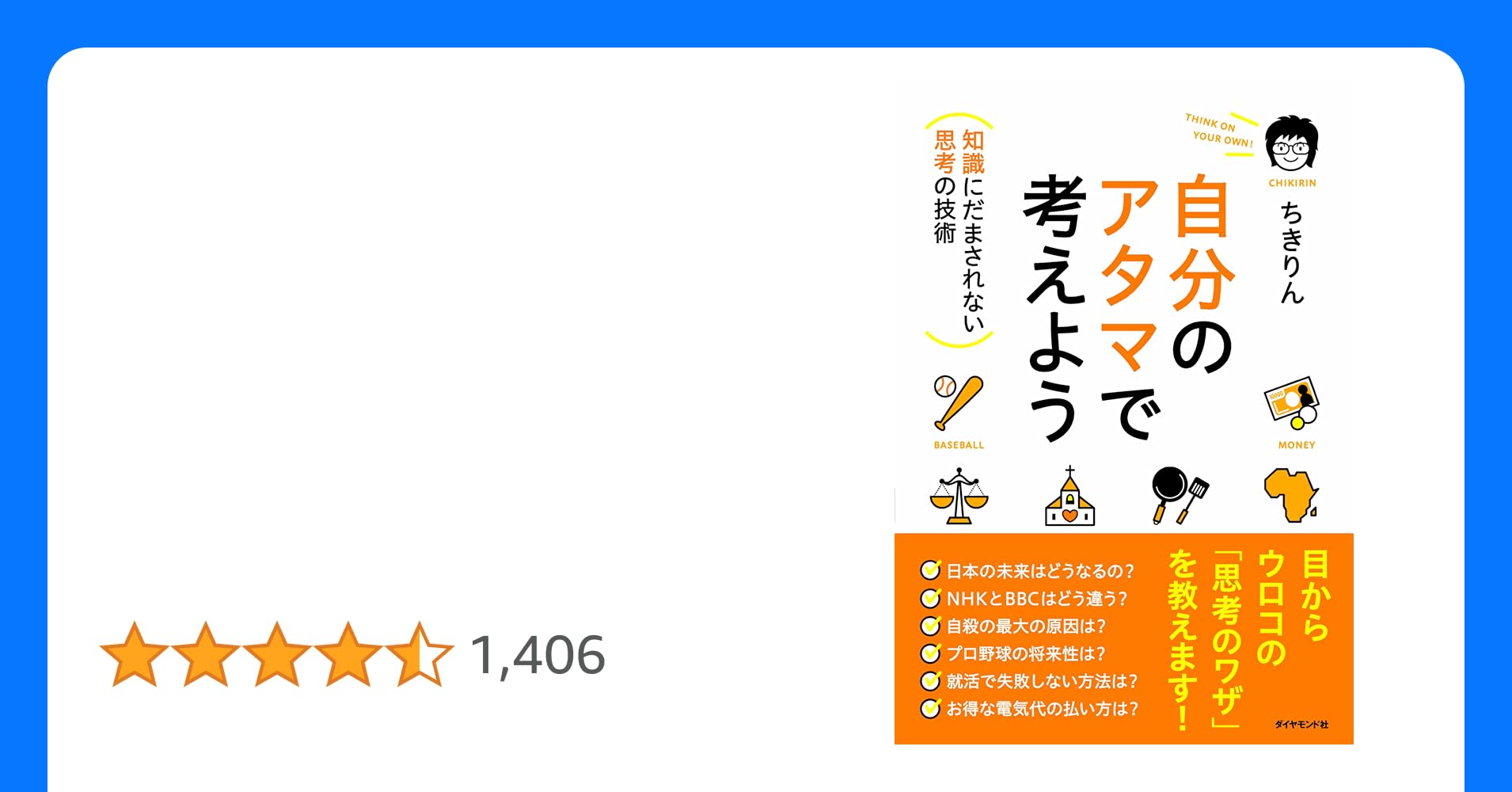 11万部突破! 月間200万PVを誇る人気ブログ「Chikirinの日記」の筆者による初の完全書き下ろし。ユニークな記事を生み出す独自の思考法を公開します! ◎プロ野球の将来性 ◎結論が出ない会議の秘密 ◎少子化問題のゆくすえ ◎婚活女子の...